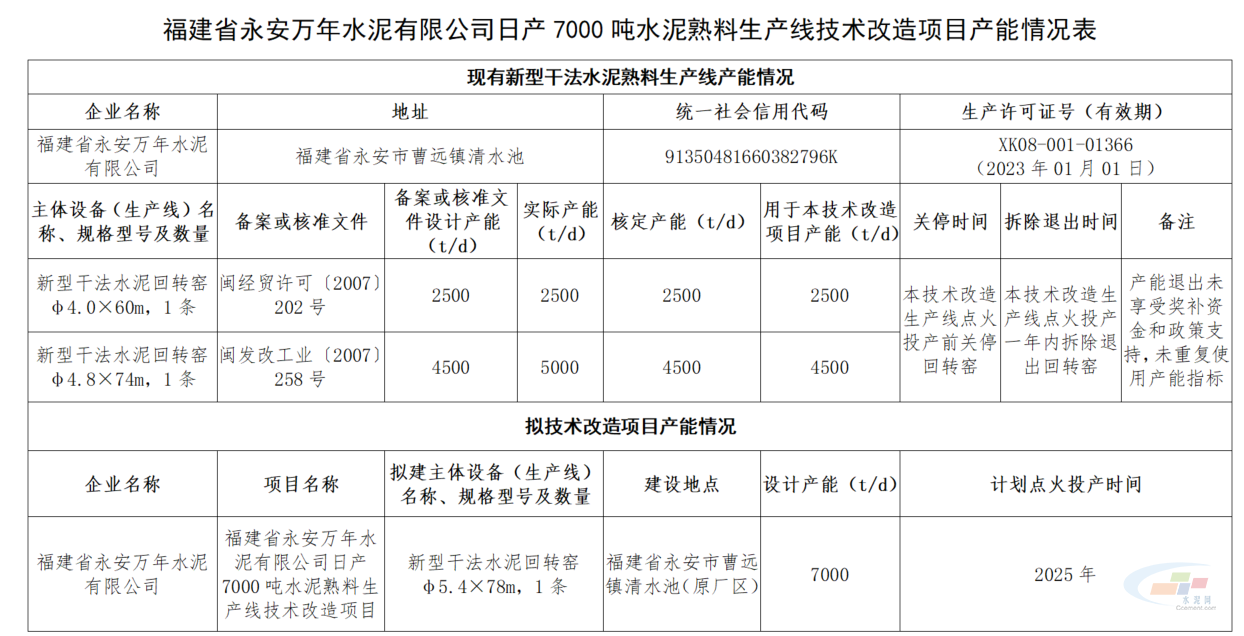 6月18日,福建省工信廳發(fā)布了關(guān)于福建省永安萬年水泥有限公司日產(chǎn)7000噸水泥熟料生產(chǎn)線技術(shù)改造項(xiàng)目產(chǎn)能情況的公示。公示期為2021年6月18日至2021年6月24日(5個(gè)工作日)。