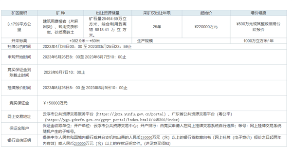 另外,采礦權(quán)出讓礦區(qū)面積3.1759平方公里(4763.84畝),礦區(qū)開采范圍內(nèi)的土地以租賃方式使用。土地的租金、青苗補償款等費用合計人民幣70000萬元,由競得人承擔(dān)并在簽訂《非油氣采礦權(quán)出讓合同》后,在2023年7月30日前支付第一期款項人民幣35000萬元到云浮市云城區(qū)財政局指定銀行賬號,第二期在2023年10月30日前繳納剩余款項人民幣35000萬元。云浮市云城區(qū)人民政府負(fù)責(zé)協(xié)調(diào)完成礦區(qū)范圍(3.1759平方公里)租地后交由采礦權(quán)競得人使用,具體租地情況由競買申請人自行向云浮市云城區(qū)人民政府了解。